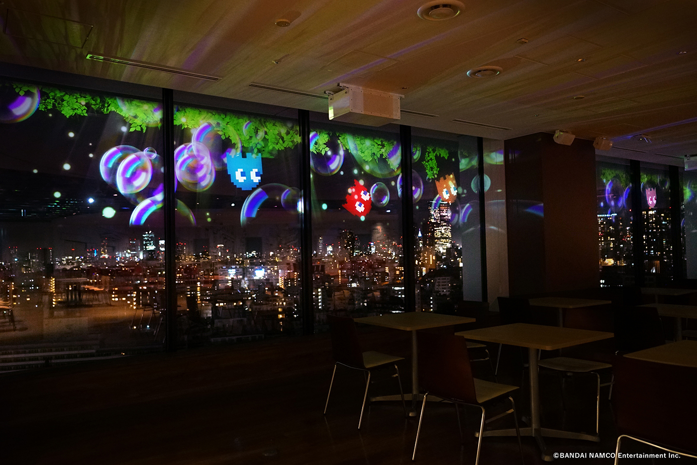 港区の美しい夜景を臨める開放的な窓面をプロジェクションマッピングの投影が可能な環境に変えることで、夜景にバンダイナムコエンターテインメントのキャラクター「パックマン」や「太鼓の達人」のどんちゃん達が登場したり、夏には花火を打ち上がらせたりなど、用途によってスペースを演出しています。