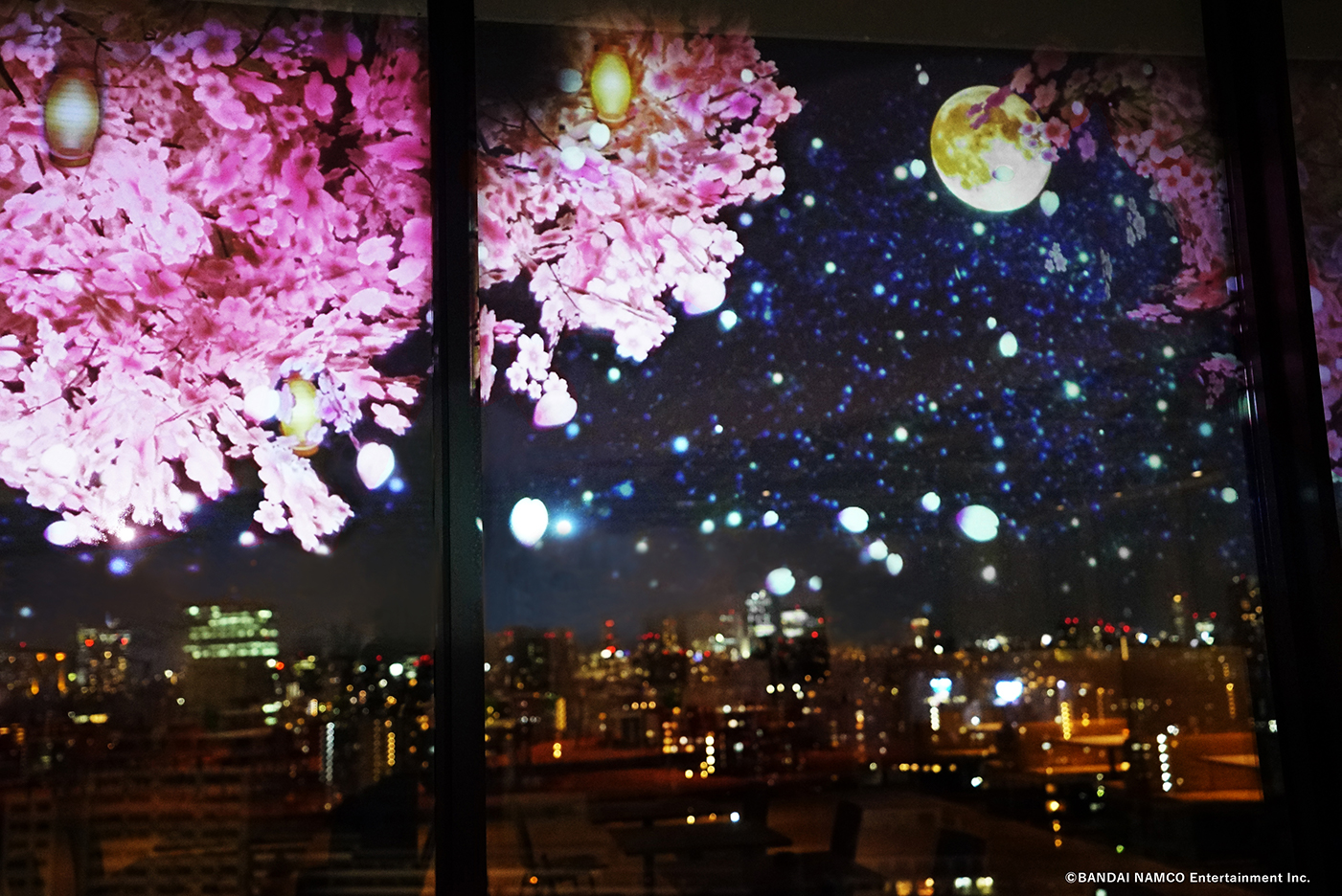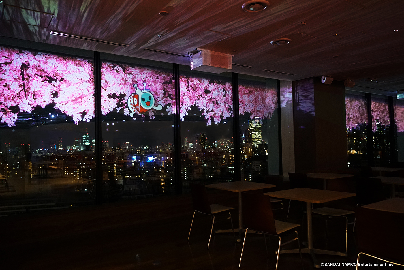 今回は、春の夜桜の景色に「パックマン」、「太鼓の達人」のどんちゃん達が登場して、夜景が楽しめるオフィス空間を盛り上げています。