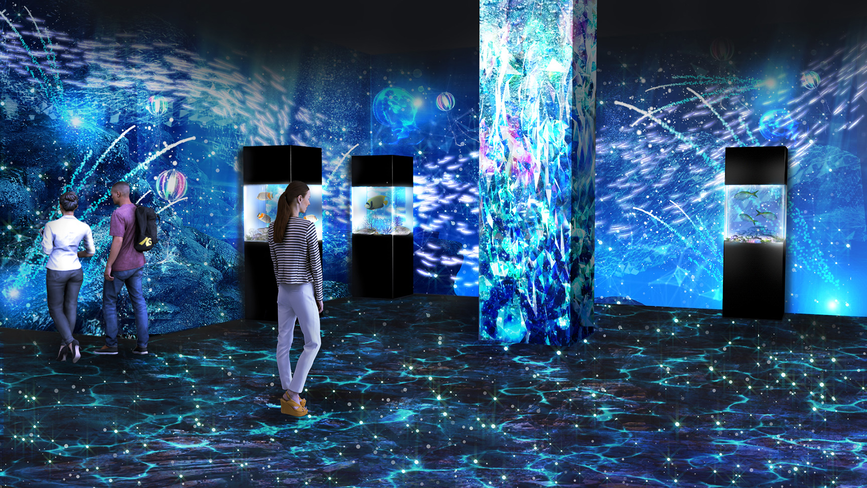 また、数分おきに空間全体が海の中の世界に包まれるショータイムがあり、ダイナミックで美しい映像と3D音響技術によるサウンドで、光り輝く海の中の幻想的な世界観をお楽しみいただけます。