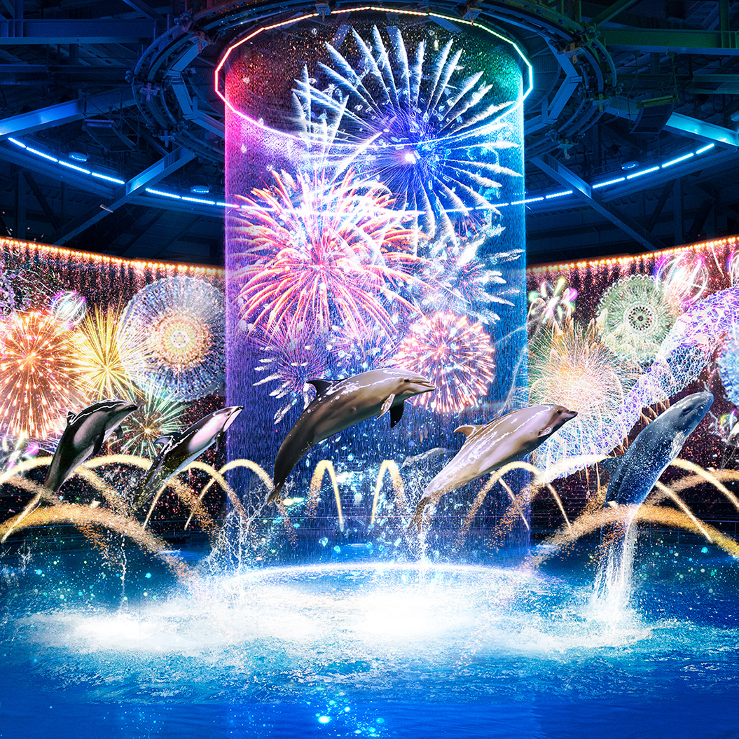 通算4度目となる「花火アクアリウム」の夜のイルカショーが今回、映像・音楽ともに新しくなります。爽快な和太鼓のリズムと共にスタートする4部構成のイルカショーは、プロジェクションマッピング映像だけでなく音楽もオリジナルで作曲しています。