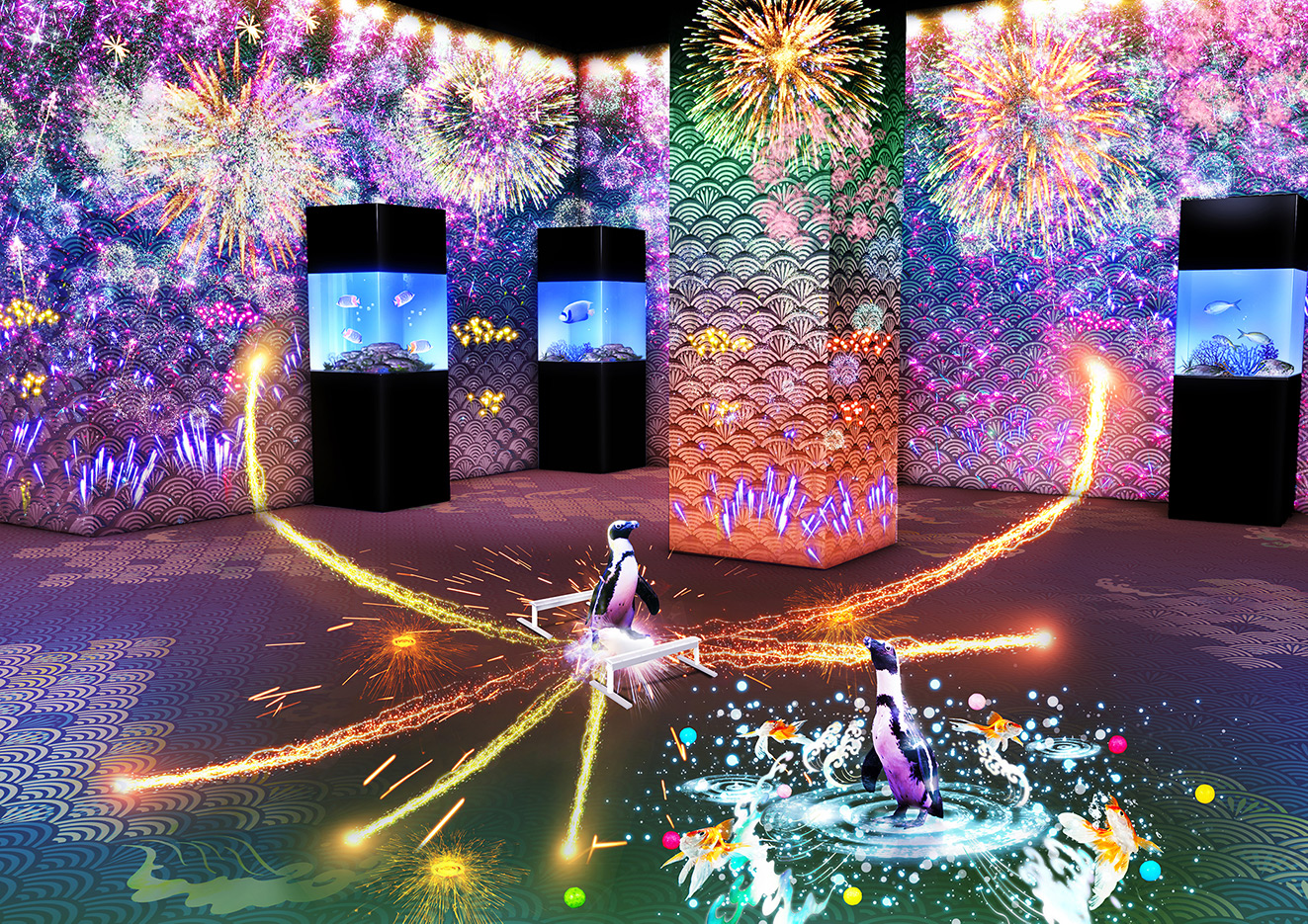 四季折々のコンテンツを展開しながら、フレキシブルな魅力と圧倒的な世界観への没入体験を提供する同エリアは、今回 “日本の夏”をイメージし、空間全体で縁日の雰囲気を創出します。ネイキッドの得意とする世界観作りや日本ならではの四季演出と生き物たちのパフォーマンスが融合する演出です。