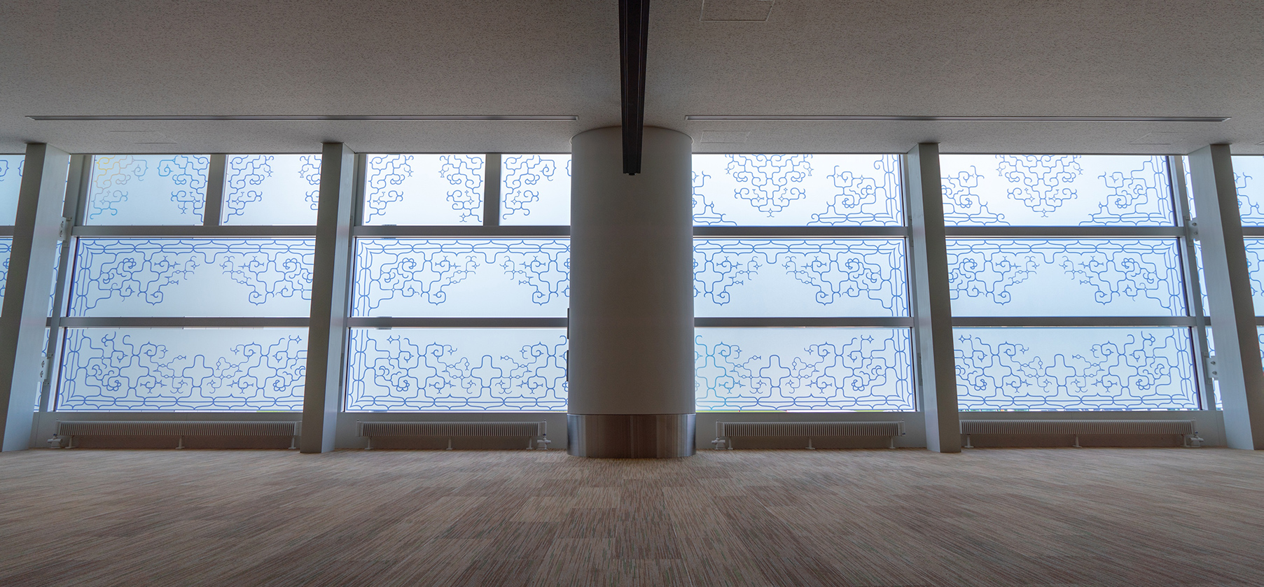 窓面装飾では、昨年度、文化庁長官表彰を受賞した津田命子氏(北海道大学アイヌ・先住民研究センター客員研究員/ツダスタジオ・アイヌ服飾文様研究家)が所持している推定100年ほど前の着物のアイヌ文様をモチーフにデザインしており、陽の光が差し込むと床にアイヌ文様が現れます。