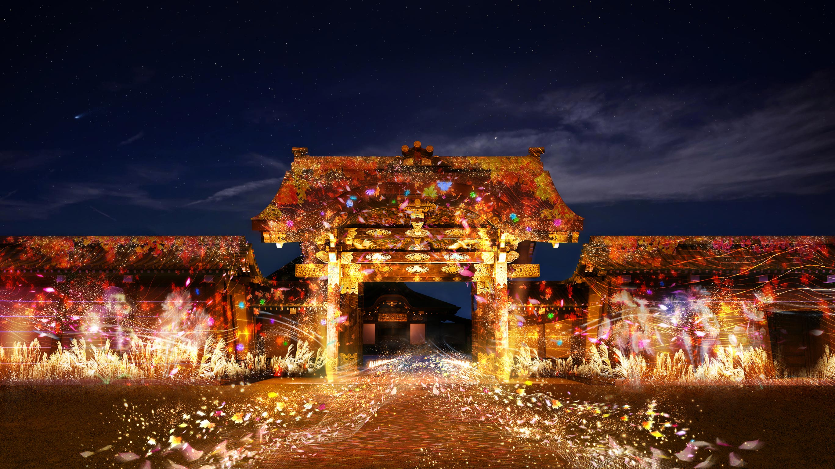 ※昨年開催した「FLOWERS BY NAKED 2018 ―京都・二条城―」のイメージ「秋風(あきかぜ)」 重要文化財 唐門/プロジェクションマッピング