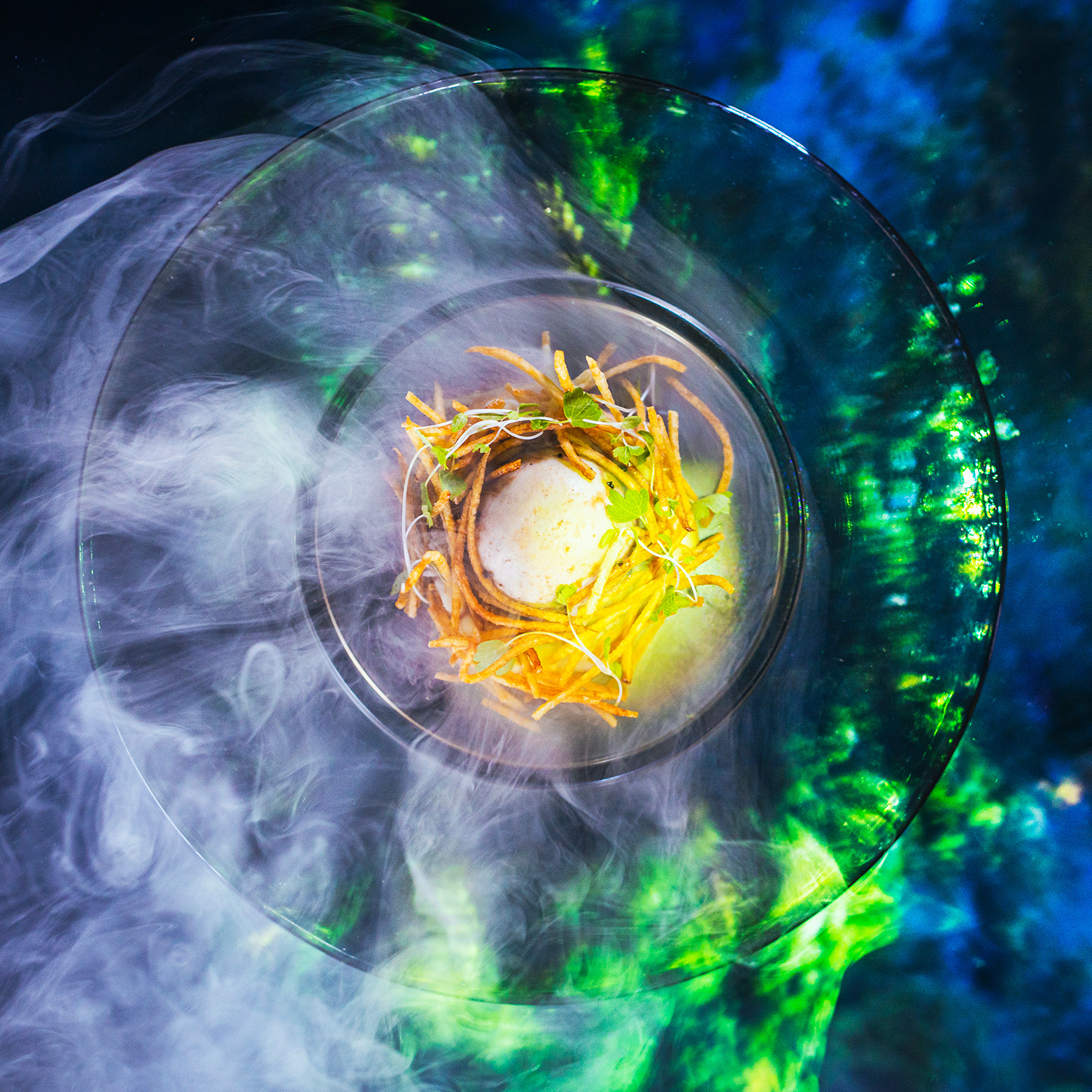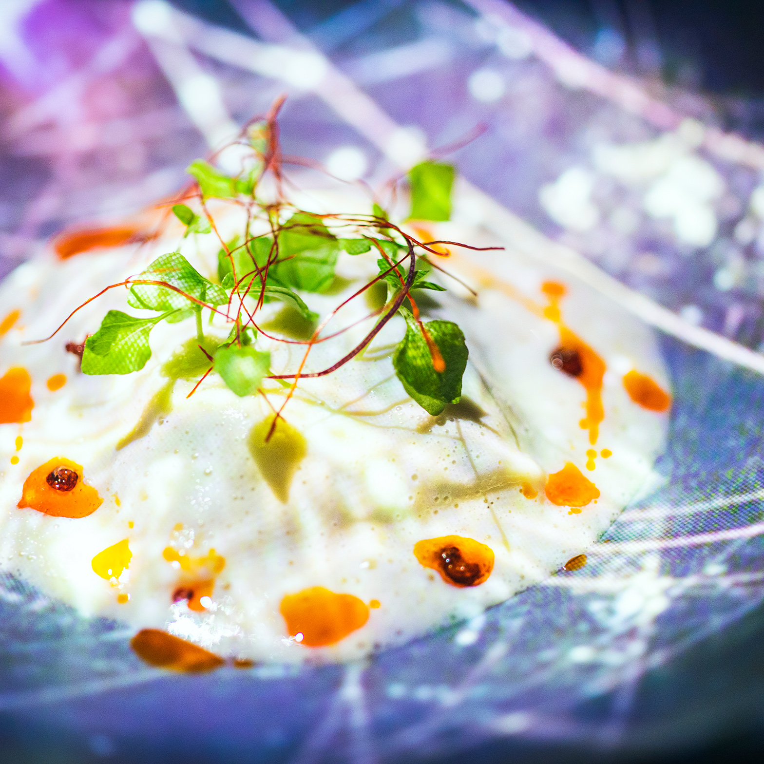 ストーリーに沿ったプロジェクションマッピング、VR、インタラクティブ演出と連動しながらお食事を進める、1日8名様限定の体験型ディナーコースです。