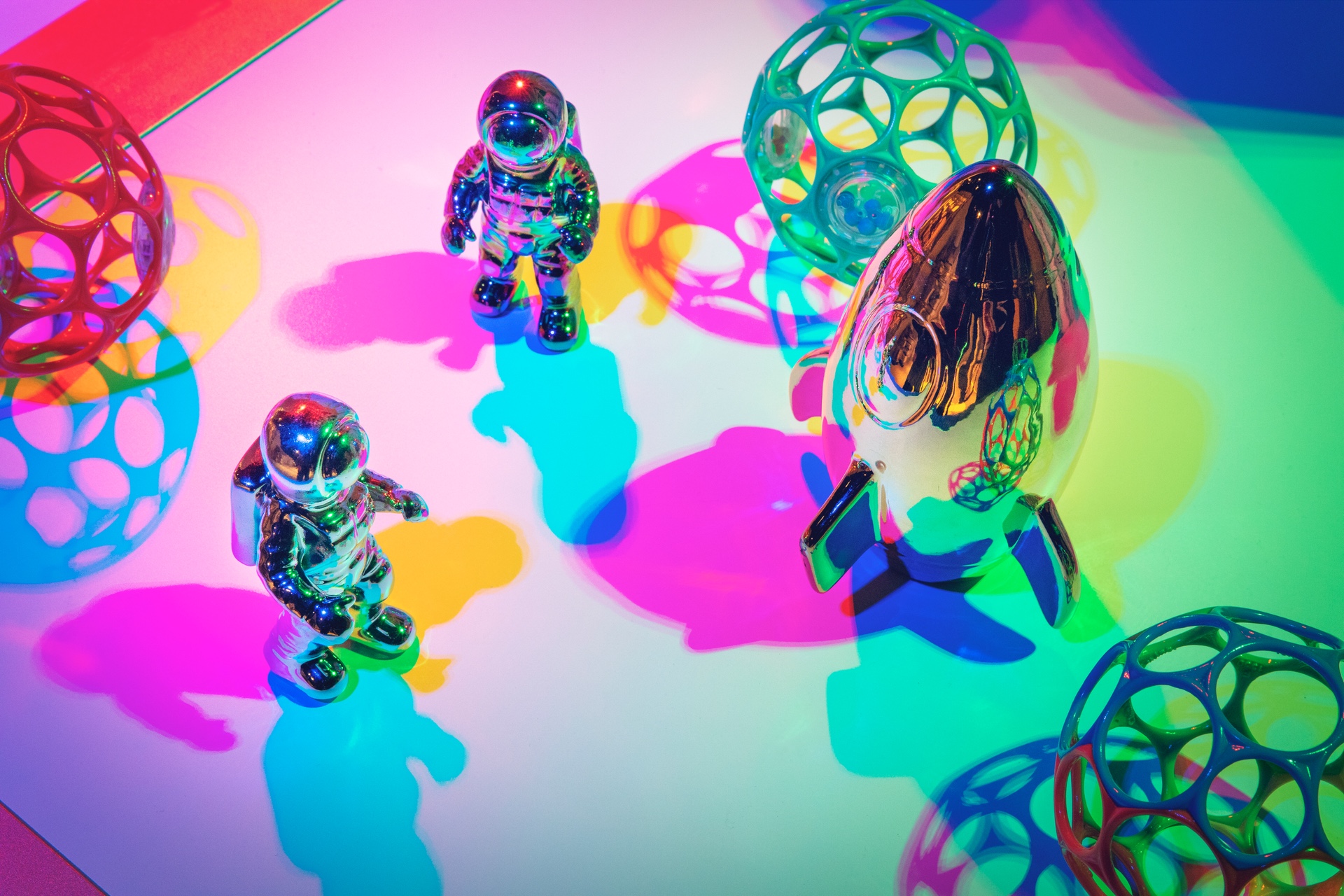 1Fフロア入口では体験型ディスプレイ演出を実施。バラエティに富んだ商品を手に取ると、惑星が弾ける映像や幾何学模様、UFOの文字の映像が現れ、惑星ステーションでのワクワク体験をお持ち帰りいただけます。また3Fフロアでは、3色の照明が作り出す影で演出する商品ディスプレイ演出をしており、パステル調からビビッド調など影の色がカラフルに変化し、単純に商品を手に取る買い物ではなく、遊びながら楽しい買い物体験を提供します。