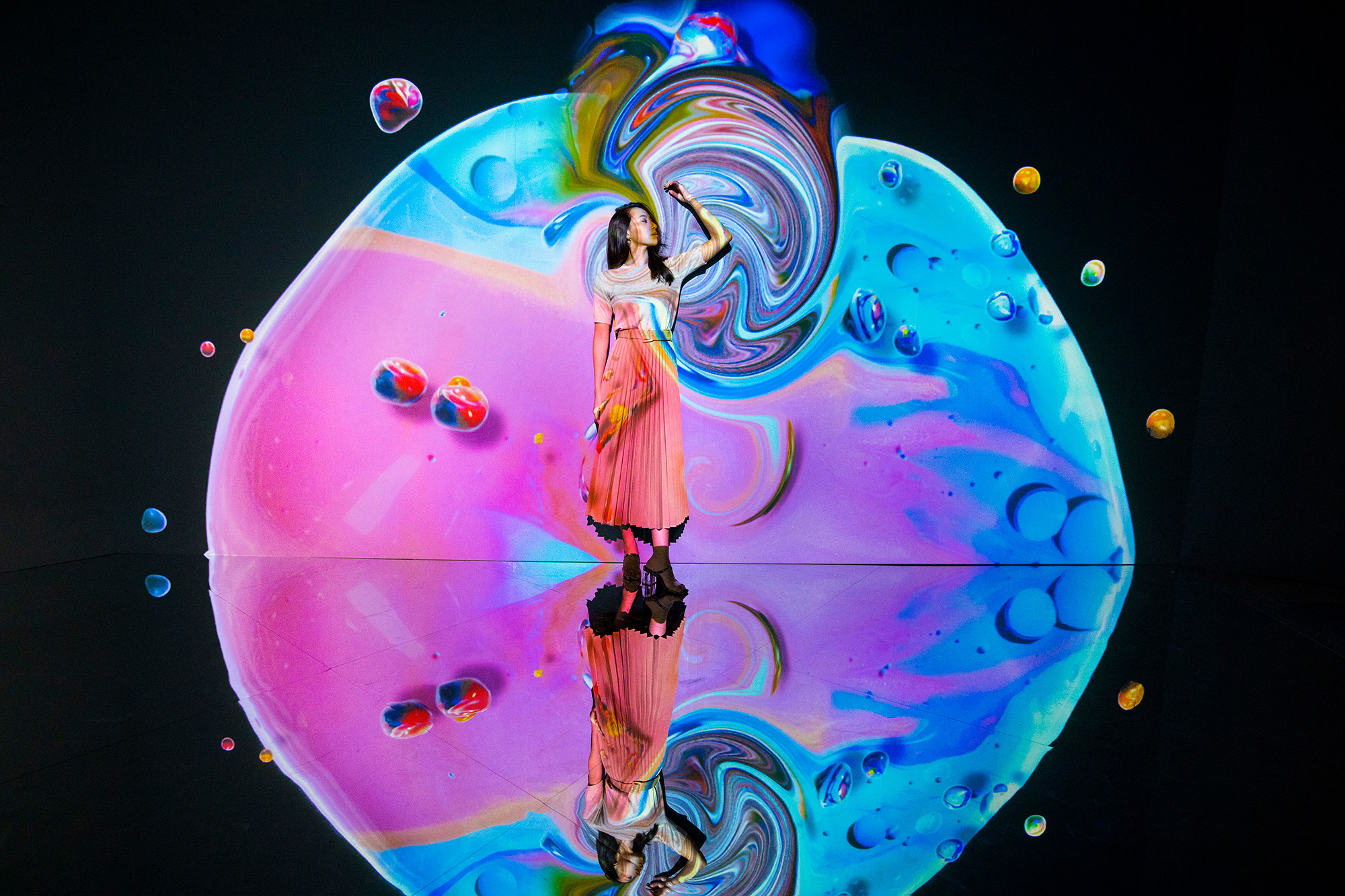 NAKED Inc.は、『Fluid Wall(フルイドウォール)』を展示。海流を表現したカラフルな液体(フルイド)を混ぜることで、クラゲの姿を生み出していき、たゆたうような幻想的な世界を作り出すインタラクティブアート作品です。