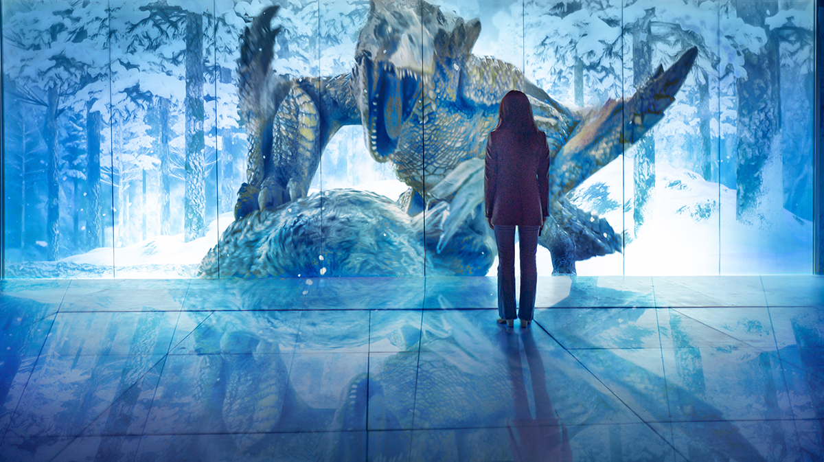 アソビルで開催する『DNP Produce MONSTER HUNTER × NAKED 「モンスターハンター15周年展」 – THE QUEST -』のメインコンテンツは、秋葉原会場実施時に好評だった歴代の「モンスターハンター」シリーズに登場する代表的なフィールドを、美術造作・映像・プロジェクションマッピングなどのさまざまな手法を駆使して会場に再現した体感エリアです。(演出・制作:NAKED)