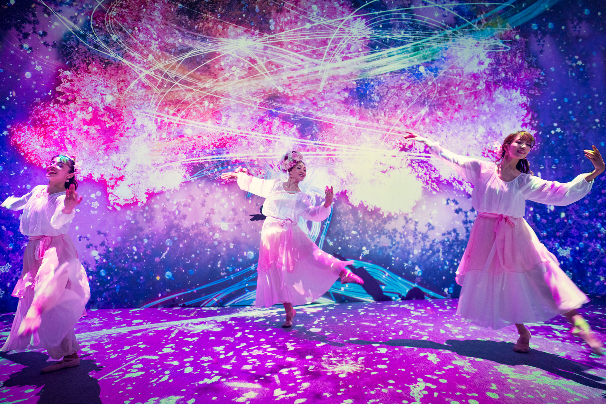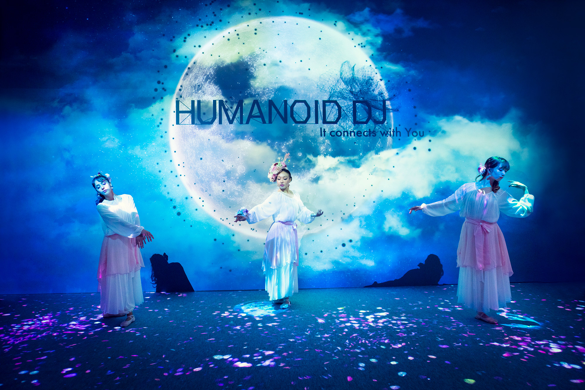 現在は、日本橋三井ホールで開催している「FLOWERS BY NAKED 2020 −桜−」の『OUSAI Garden』エリアにて、ライブパフォーマンス「LIVE BY HUMANOID DJ 花宴(はなのえん)」を披露しています。その場にいる人々の数、年齢、そして感情の解析情報とダンサー「春の精霊」に付けたセンサーによって、音と映像がリアルタイム生成され、一度として同じものがないライブパフォーマンスを創り上げています。歌と舞いで花を愛でる、お花見の原型となった宴のスタイルをコンセプトに、この一瞬だけの特別なお花見を楽しめます。