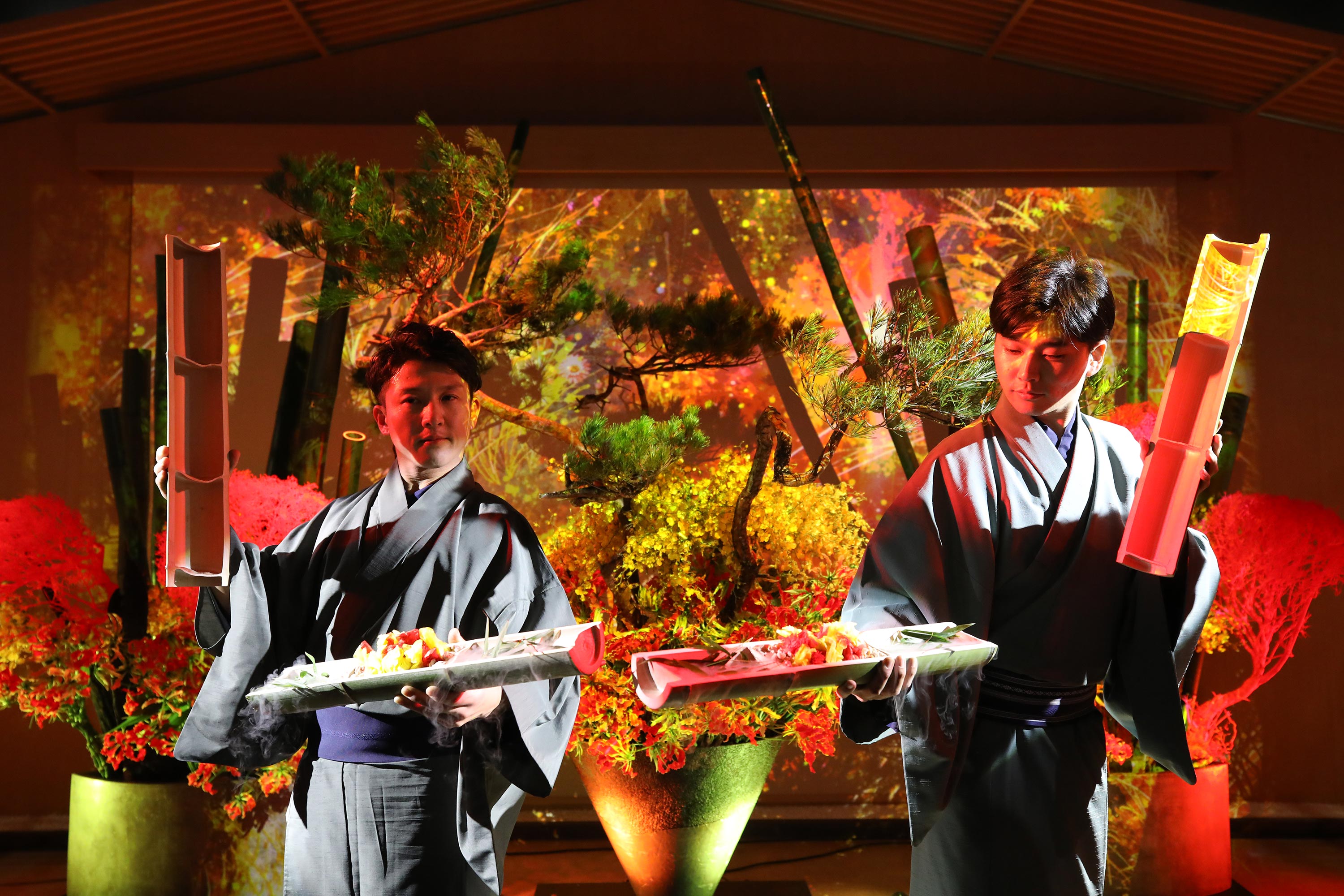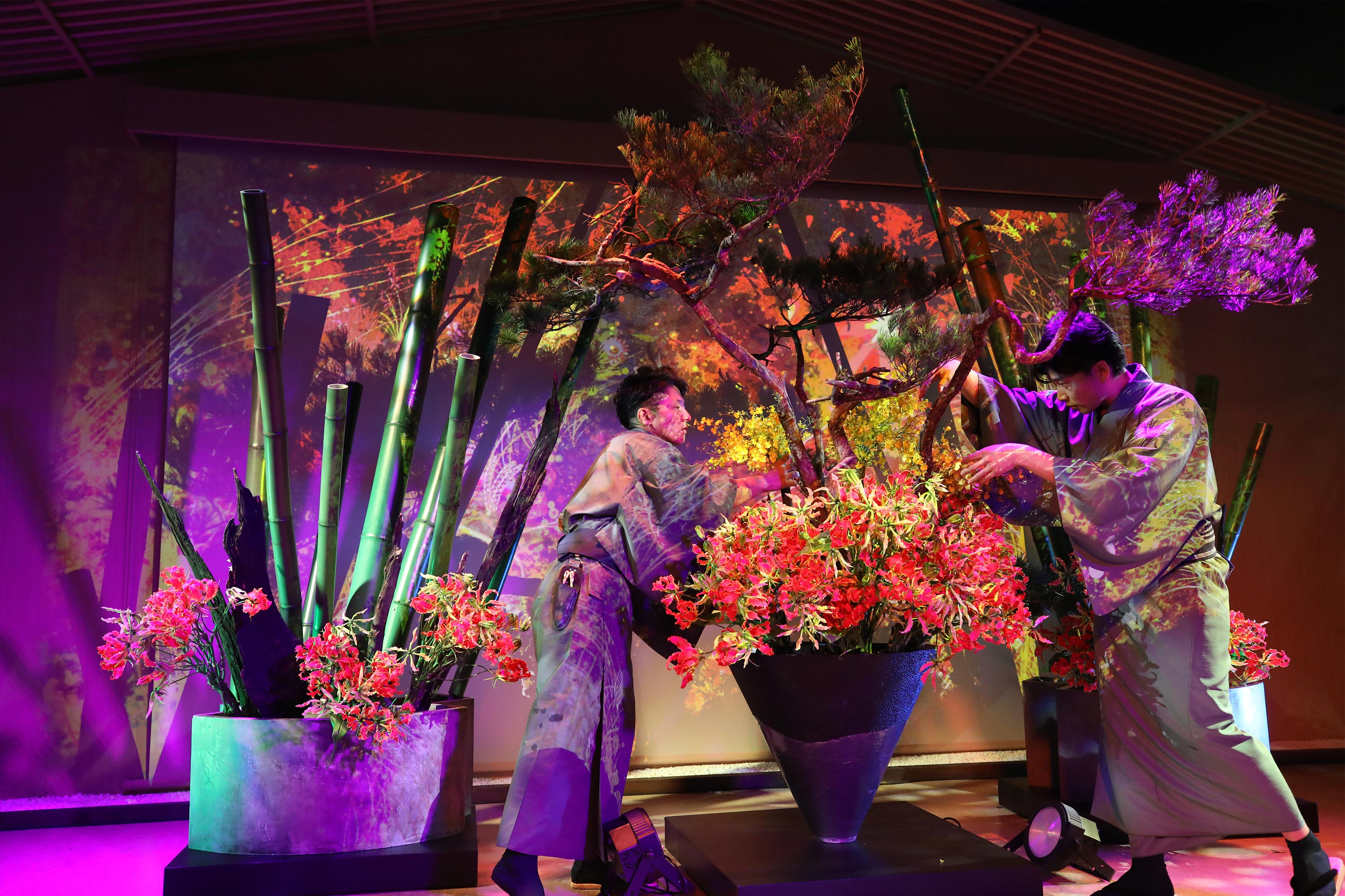 今回のショーでは、華道家元池坊の若手華男子グループ「IKENOBOYS」から江木淳人氏・田中伸明氏を迎え、”いけばな”とプロジェクションマッピングのライブパフォーマンスを実施。和太鼓や尺八といった和楽器やベースギター、パーカッションなどにより奏でられる生演奏と香りの演出で迫力あるショーとなり、多くの来場者を魅了しました。また、ショーのラストには、京都の老舗料亭「京都𠮷兆」より、”いけばな”から生まれた果実をイメージしたデザートが来場者へと振る舞われました。