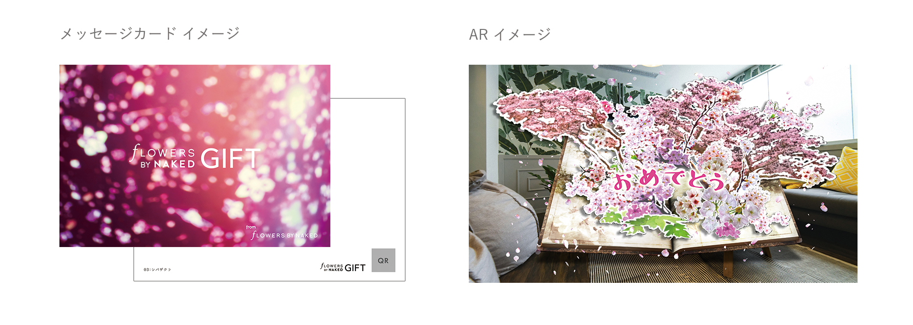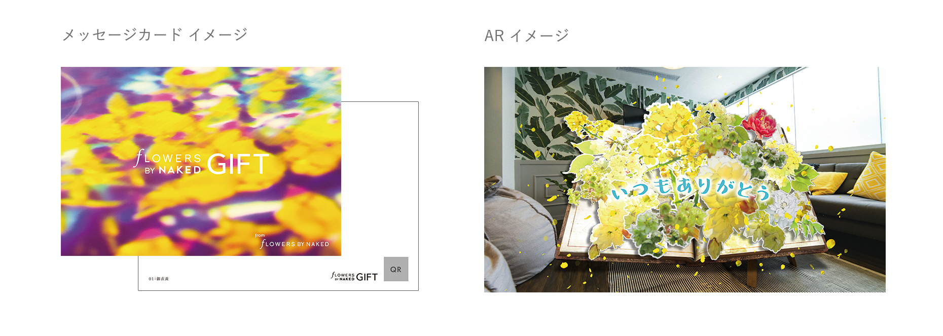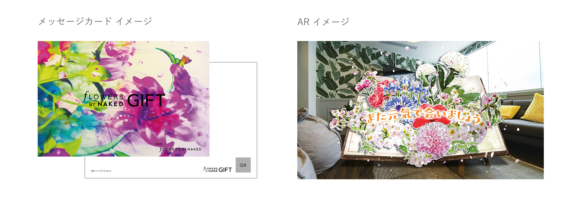 第一弾は、花の体感型アート展「FLOWERS BY NAKED」の体験をARで贈るメッセージカードキット。緊急事態宣言や東京アラートは解除されても第二波への備え等、COVID-19の影響で自由に外出がしづらい状況は続いています。しかし、実感のあるコミュニケーションや心が動く瞬間はリアルなコミュニケーションの方が起きやすい。そこで、ネイキッドの強みである、リアル(オフライン)とヴァーチャル(オンライン)を融合した体験を贈る体験型ギフトを作れないかと考えました。